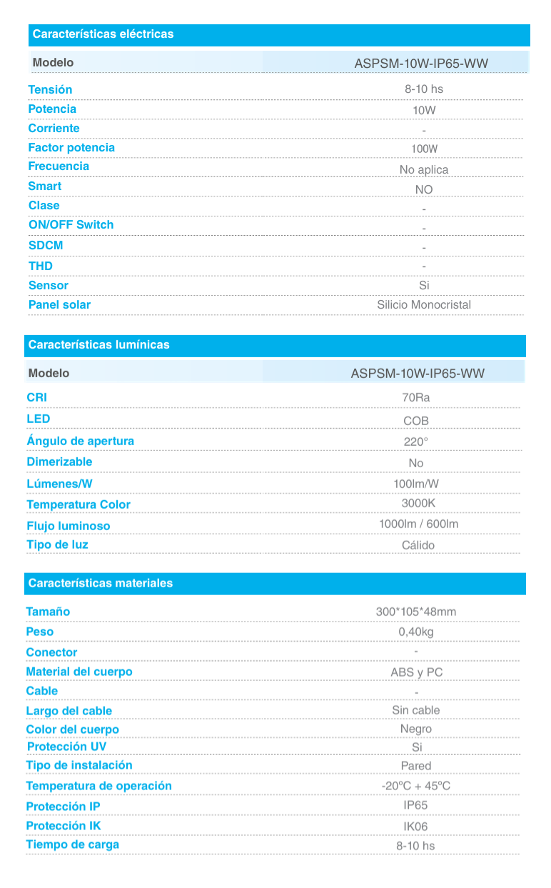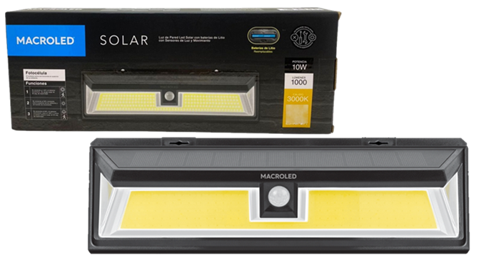 Artefacto solar de pared 10w con sensor de movimiento y fotocontrol. Luz cálida