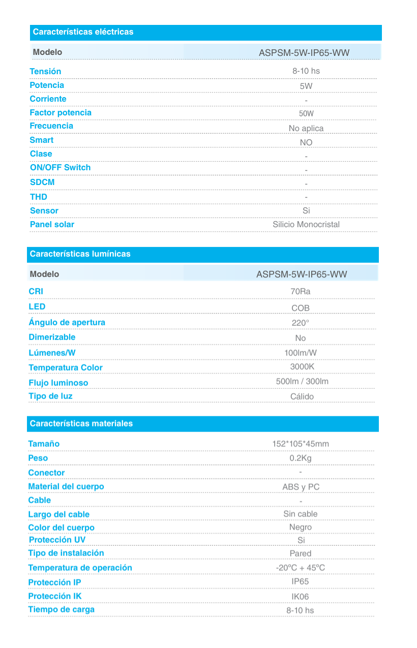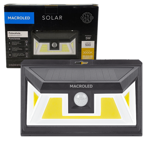 Artefacto solar de pared 5w con sensor de movimiento y fotocontrol. Luz calida