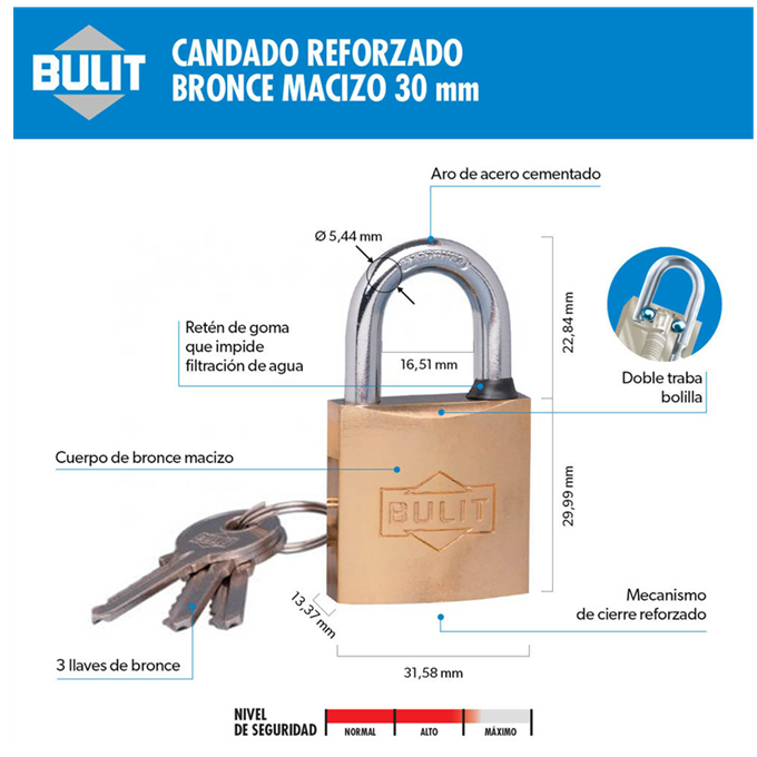 Candado bronce reforzado, doble traba 3 llaves 30mm