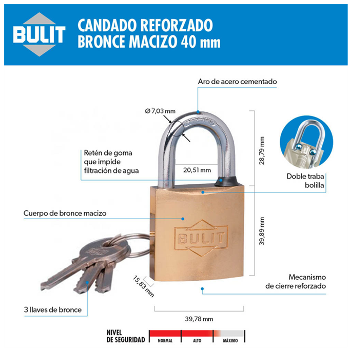 Candado bronce reforzado, doble traba 3 llaves 40mm