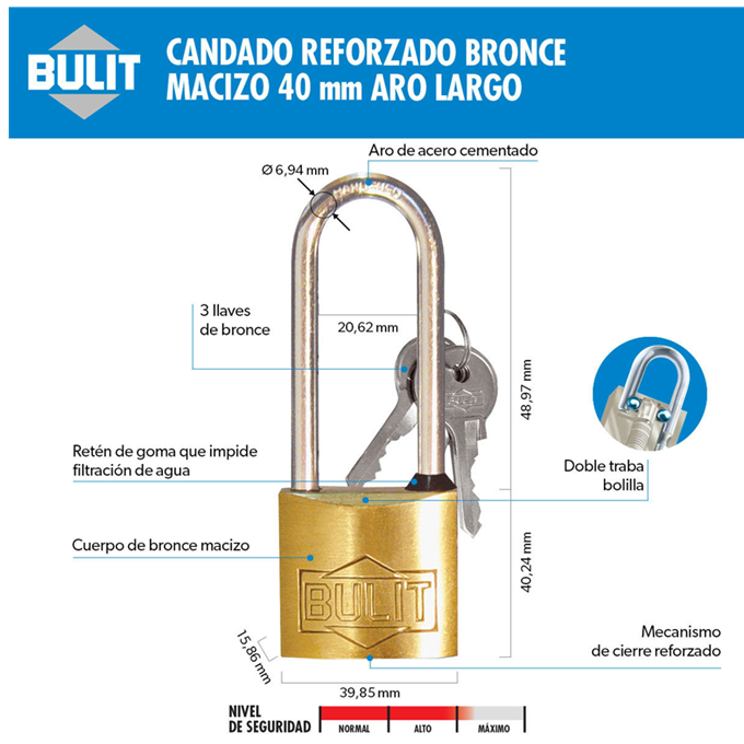 Candado bronce reforzado, doble traba 3 llaves 40mm aro largo