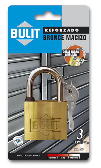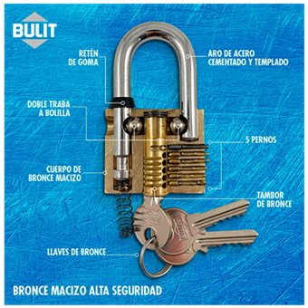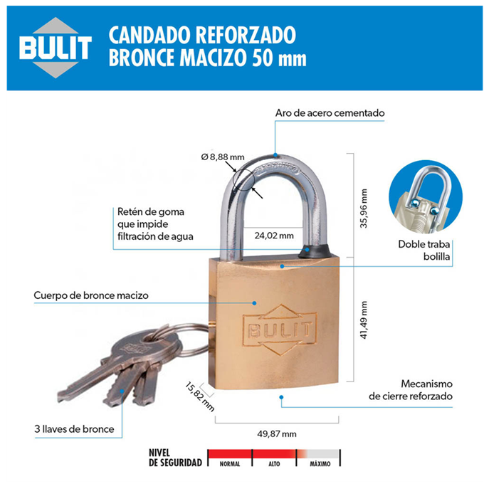 Candado bronce reforzado, doble traba 3 llaves 50mm
