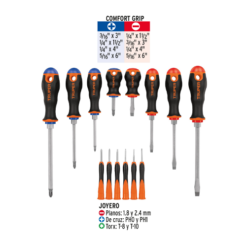 Juego de 8 destornilladores con mango comfort grip + 6 para joyero