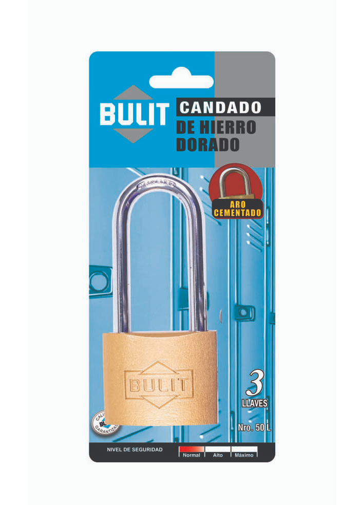 Candado hierro macizo dorado 3 llaves.50mm aro largo