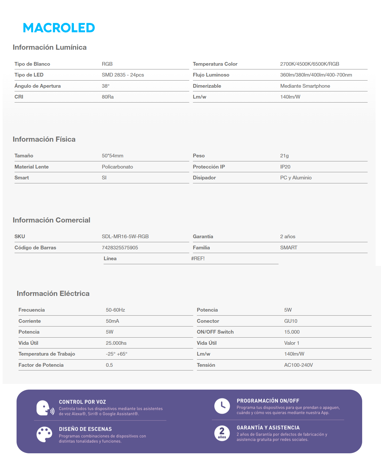 Lámpara dicroica smart rgb 5w gu10. Con wifi y bluetooth