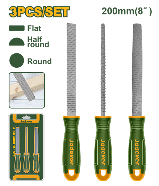 Kit de 3 limas para madera 20cm. Lima plana, redonda y semiredonda