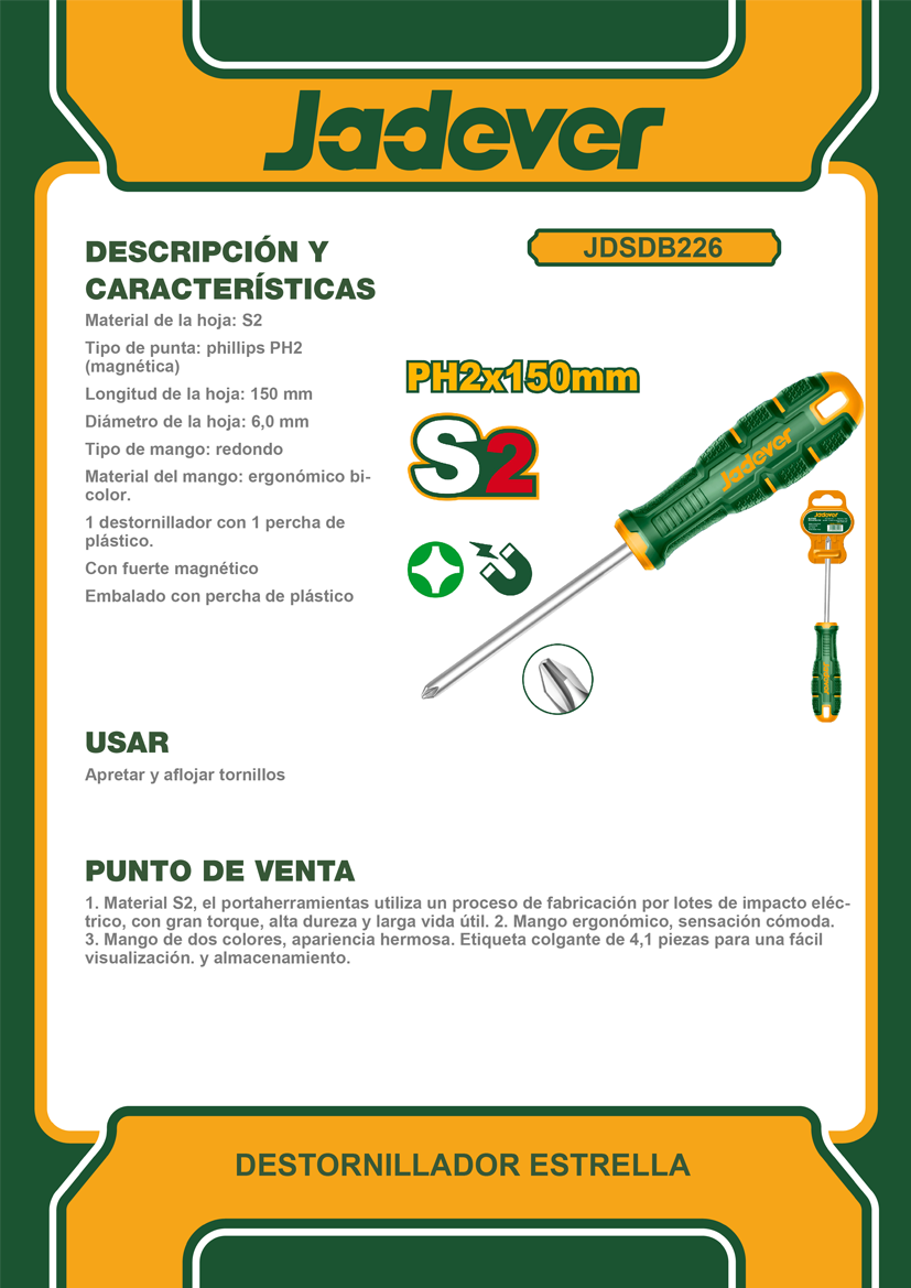Destornillador pillips PH2 6x150mm. Punta magnética. Mango ergonómico