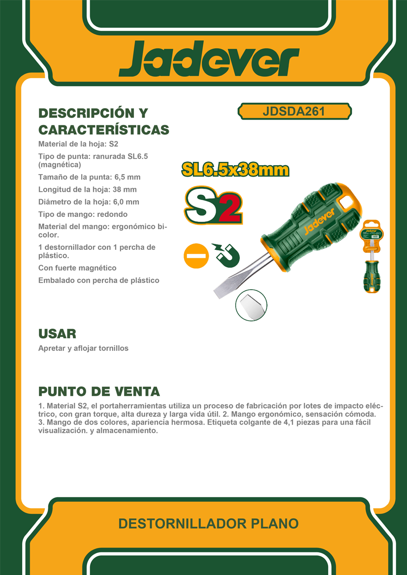 Destornillador plano cónico 6.5x38mm. Punta magnética. Mango ergonómico