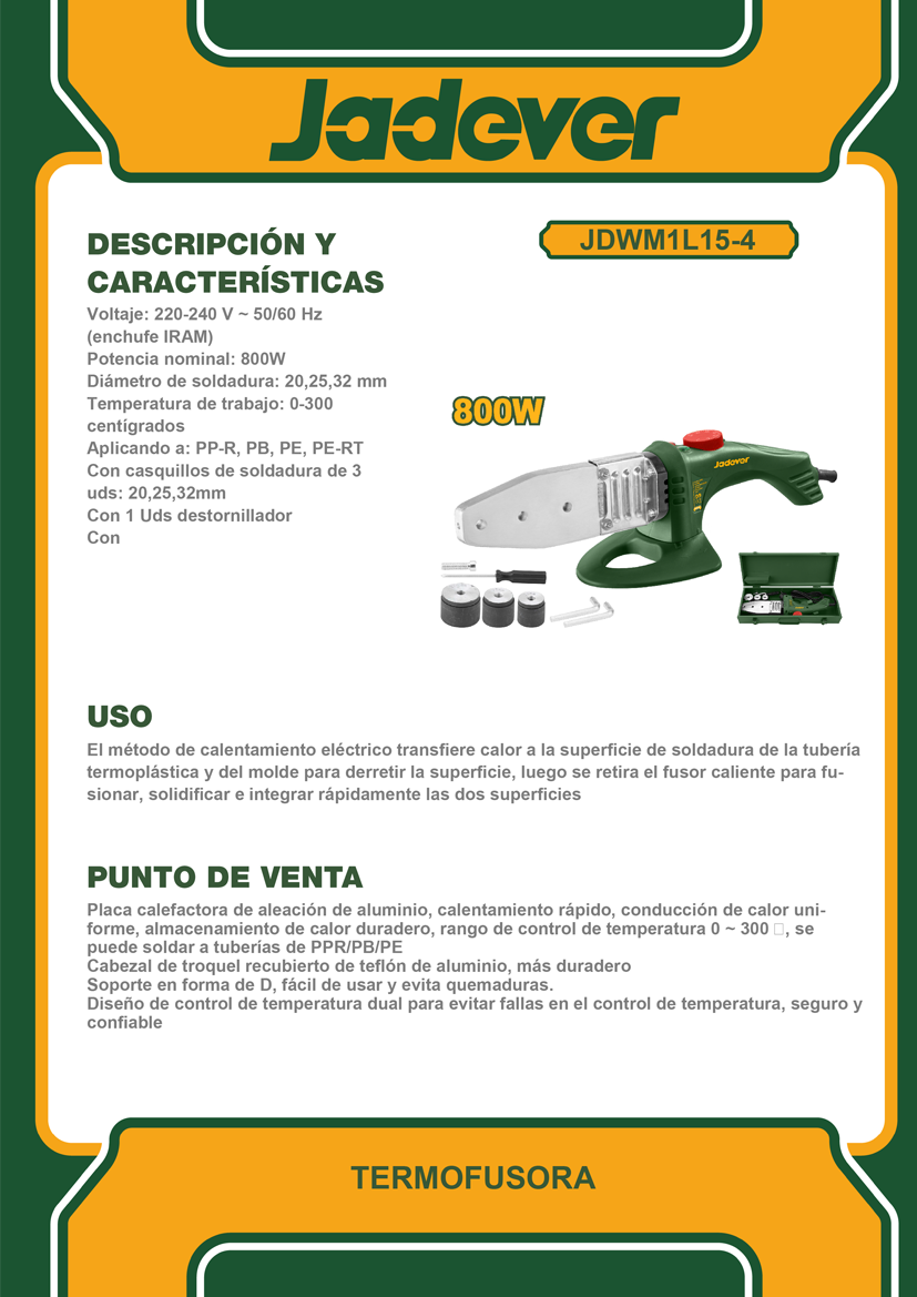 Termofusora 800w. 220v. Diámtero de soldadura: 20, 25, 32mm . Incluye accesorios