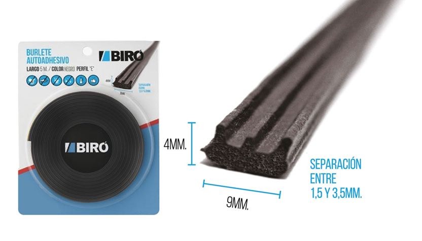 burlete autoadhesivo perfil "E" 5mtsx9mmx4mm. Color negro