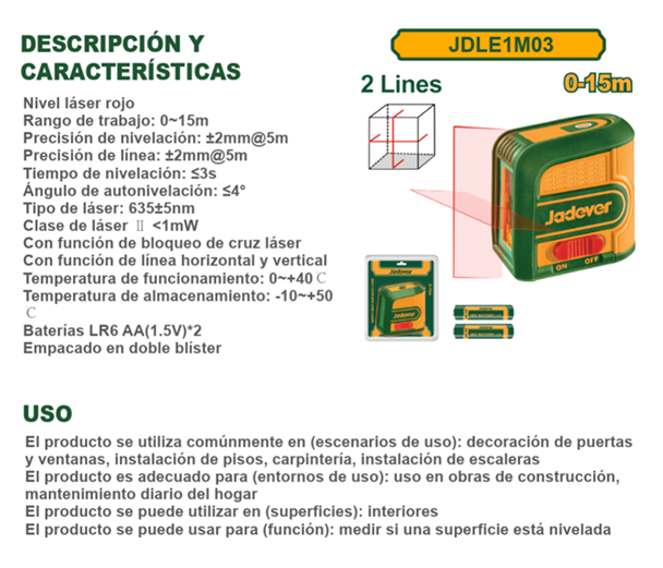 Nivel laser rojo 2 ejes. Rango de trabajo de 0-15mts a pila (*)