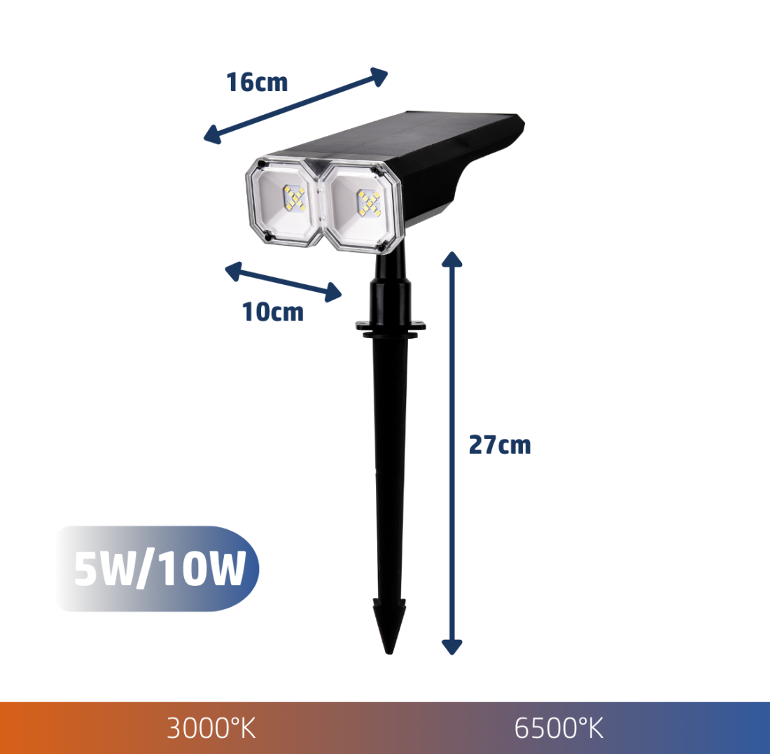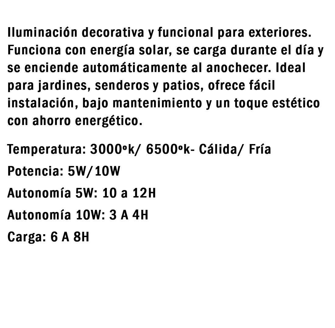 Estaca solar de jardin 10w. Temperatura: 3000ºk/ 6500ºk (Luz cálida y luz fría)