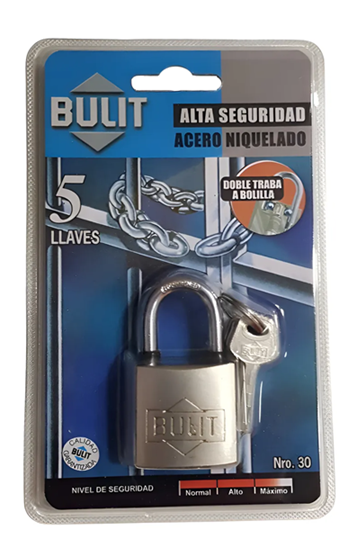 Candado Maxima Seguridad Doble Traba 5 Llaves. Acero Niquelado 30mm.